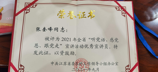 作为2021年中国农民丰收节江苏主场活动的重要项目之一,“听党话、感党恩、跟党走”宣讲活动于9月下旬在新沂市棋盘镇郑梁村小杨庄文化礼堂举办。句容市市青年农民创业之星张奎峰与其他7名优秀宣讲员以亲身经历为蓝本,现场宣讲“三农”故事获得好评。省人大常委会副主任曲福田、省政府副秘书长诸纪录等同志到场观摩。省委农办综合处、省农业农村厅社会事业促进处以及100多位农民朋友参加宣讲活动。在活动现场,张奎峰等8名优秀宣讲员还与农民朋友交流了“致富经”与“奋斗史”。