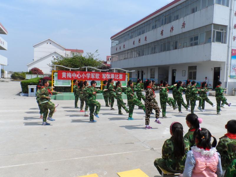 4月10日这一天,黄梅中心小学沉浸在嘹亮的军歌声中。为了进一步激发学生爱国主义热情,结合学校特色,学校举行唱军歌、打军体拳比赛。赛场上,不论是一年级小朋友,还是六年级大哥哥大姐姐,都显示出高昂的热情。阵阵歌声唱出了黄小学生对祖国的无限热爱,飒飒英姿打出了黄小学生的精气神。黄梅中心小学把唱军歌、打军体拳列入学校常规工作之一,要求每班有自己的军歌(班歌),每位同学都能熟练掌握十六路军体拳法,并作为学生“体艺2+1”的必备项目,为强健学生体魄打下良好基础。