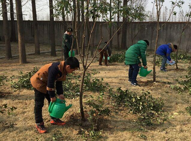 阳春三月植树忙。在学校护工的帮助下,同学们栽下一棵棵小树苗。并在老师的指导下,用小桶给小树苗一桶一桶的浇水,虽然累得满头大汗,气喘吁吁,衣服和鞋子上沾满了泥土,但是个个显得特别开心。在同学们的辛勤劳动下,树苗便“亭亭玉立”在沃土上。眼前这一片新生的春意让大家满心欢喜,因为今天种栽下小树苗,学校就会增添一片新绿,就能呼吸到更多的新鲜空气。
