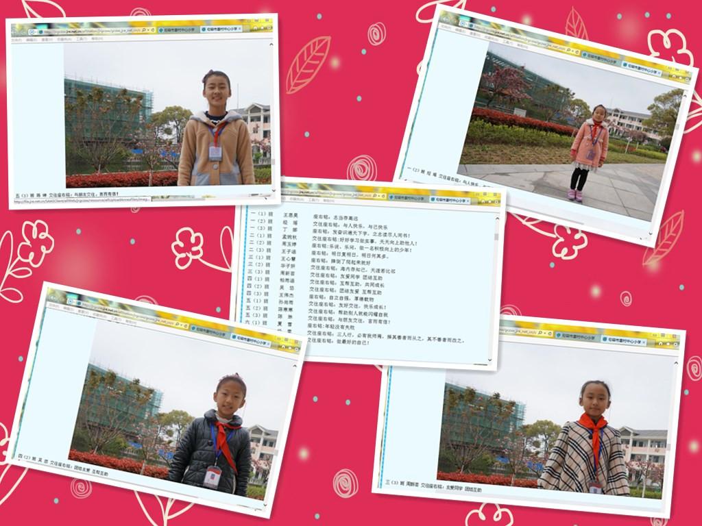 该校每月针对一“星”强化教育,本月为“交往之星”,对应“言谈之礼、待人之礼、行走之礼、游览之礼”,指向为:课间秩序、路队纪律、文明用语、爱护公物等。经过各班级民主推荐,学校第一批“交往之星”孕育而生,在表彰前,18位同学的照片、简单信息、交往座右铭等信息公示在校园网上,接受全校师生两周的监督,两周后,没有异议的,即可成为真正的“交往之星”。